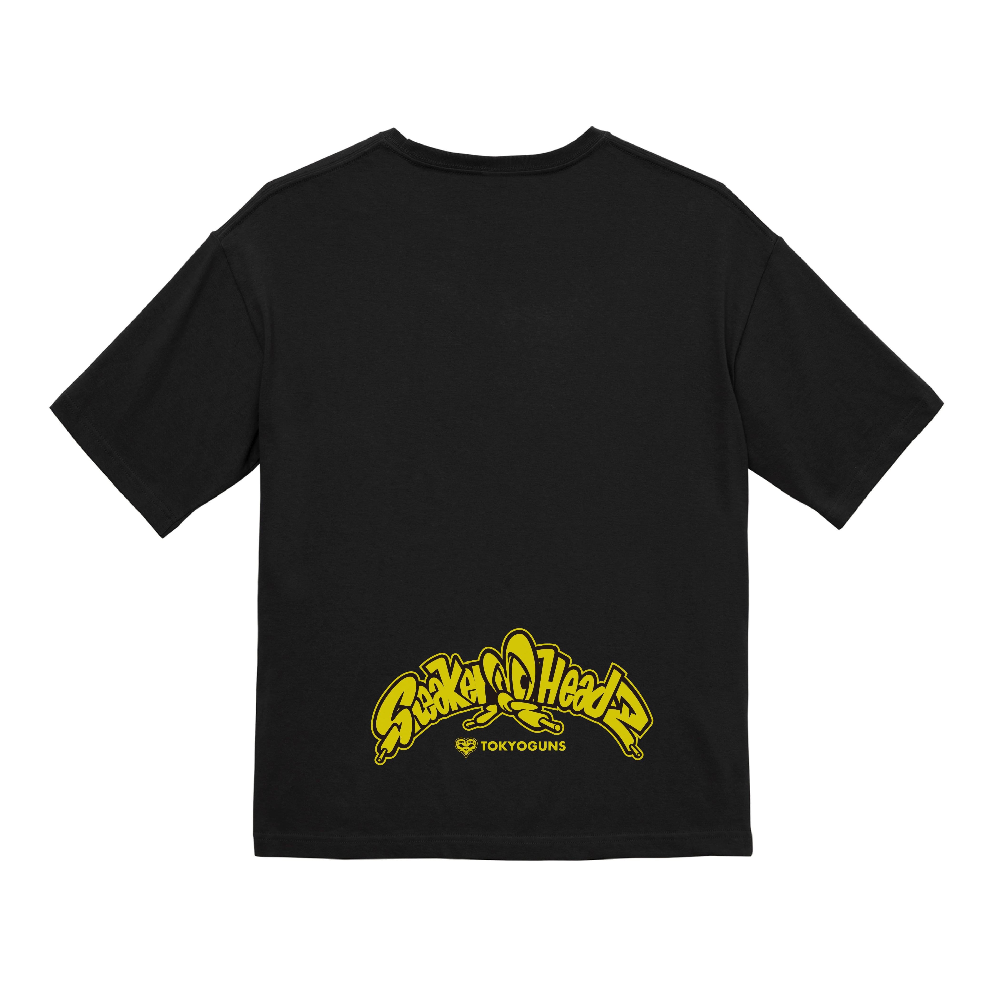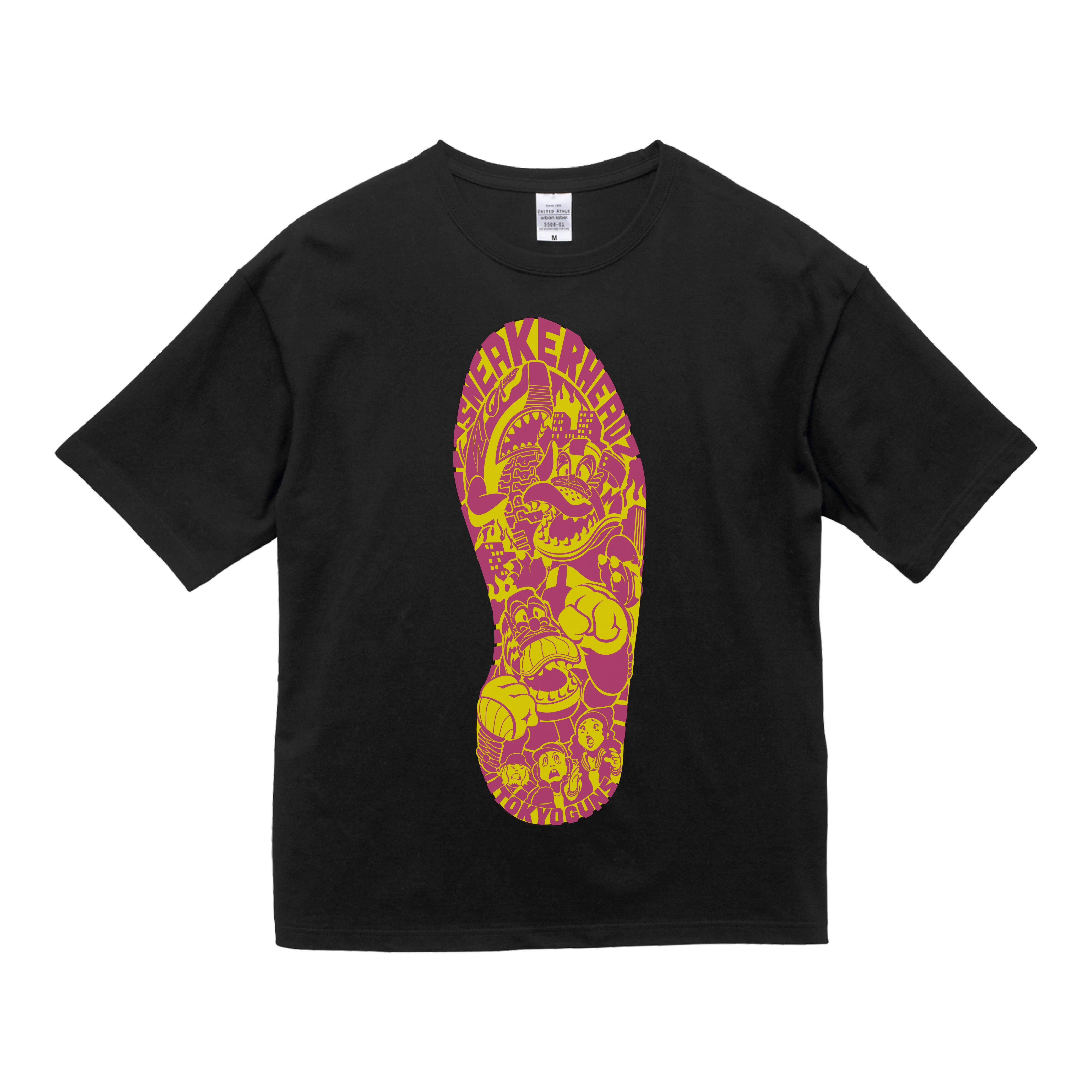 アウトソールの足形の中に、怪獣達が暴れているイラストを施したプリントのTシャツです。